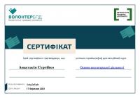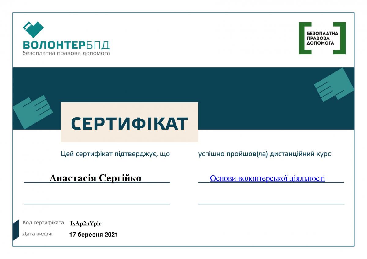 Даний проєкт проводився з метою залучення громадських активістів, які виявили бажання стати волонтерами надання безоплатної правової допомоги. Так, Анастасія успішно пройшла дистанційний курс «Основи волонтерської діяльності» та разом із сертифікатом отримала досвід здійснення волонтерської діяльності у сфері надання безоплатної правової допомоги.