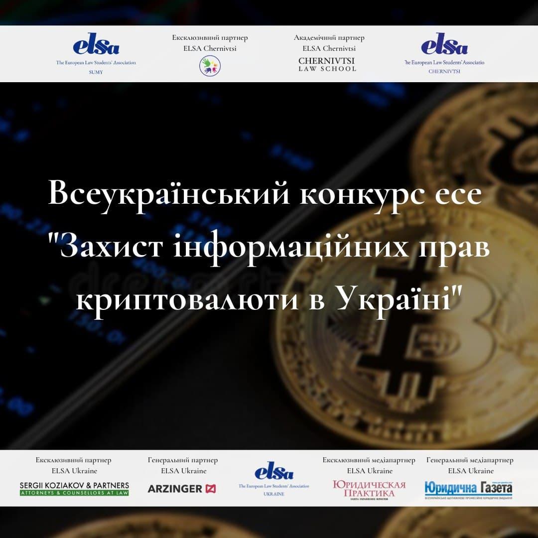 У зв’язку з вашими численними проханнями ELSA Sumy та ELSA Chernivtsi продовжують подачу робіт Всеукраїнського конкурсу есе на тему: «Захист інформаційних прав криптовалюти в Україні» до 30 квітня!