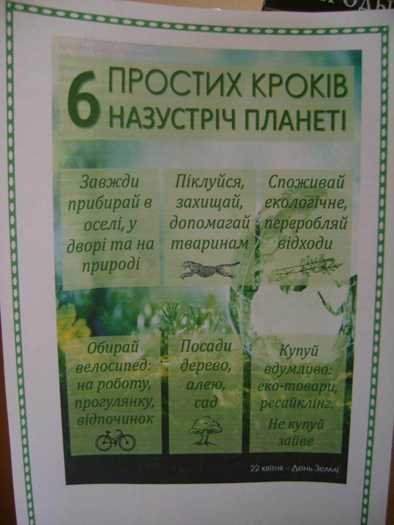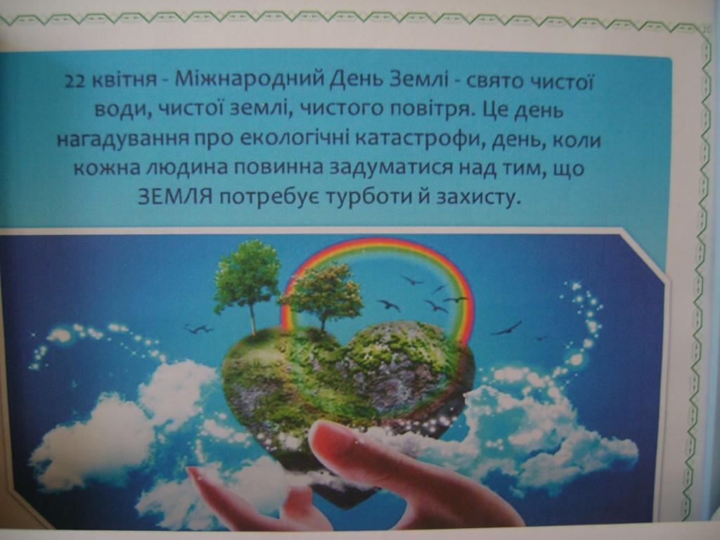 Щорічно, 22 квітня люди по всій планеті відзначають День Землі. Це свято чистої Води, Землі й Повітря, яке має на меті об’єднати людей планети для захисту навколишнього природного середовища, привернути їх увагу до екологічних проблем. І, водночас, цей день - нагадування про екологічні катастрофи, що сталися та можливість для кожного замислитися над тим, що він може зробити для розв’язання цих проблем.