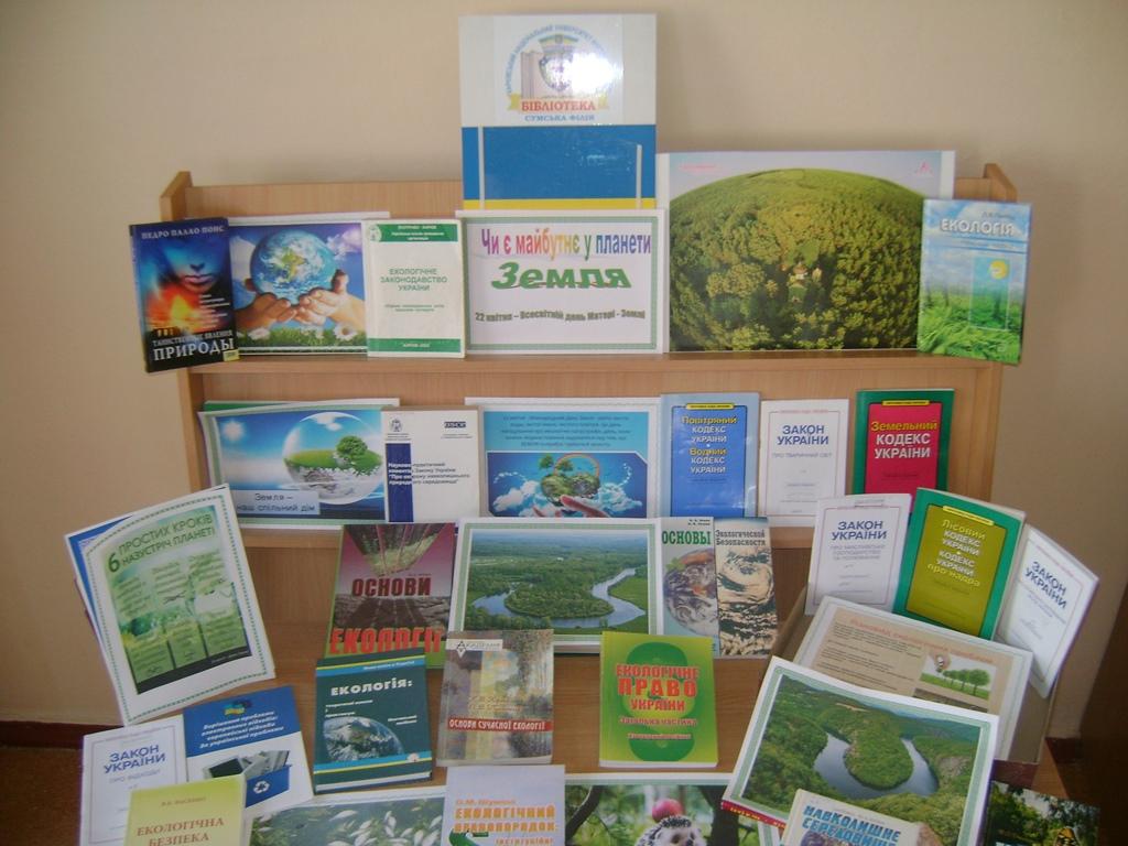 Бібліотека також долучилась до святкування Дня Землі. Нами створено виставку – діалог «Чи є майбутнє у планети Земля?» як нагадування про неперевершену красу нашої планети, яку ми маємо зберегти. На виставці представлена література за однією з найактуальніших проблем сучасності - забруднення та погіршення стану навколишнього середовища, охорони природи, раціонального природокористування, а також озеленення наших міст і ландшафтної архітектури.