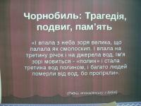 Біблійна зірка Полин, що впала тоді на нашу землю, надовго отруїла не лише наші хліб, воду, повітря, а й нашу кров. Відтоді збігло 35 років, проте Чорнобиль і досі залишається незагоєною раною, що ятрить пам'ять та не забувається. Ця трагедія зачепила долю кожного українця, сколихнула життєве дерево багатомільйонного народу.