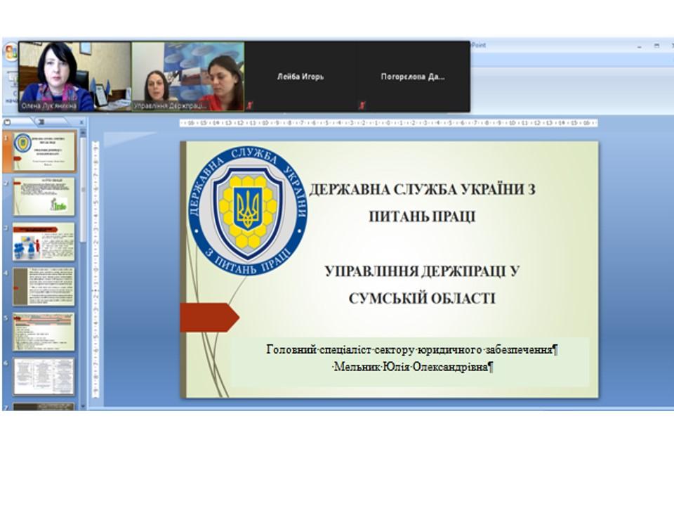 У переддень Всесвітнього дня охорони праці, який в Україні відзначають 28 квітня як День охорони праці, для студентів 1-го курсу було проведено бінарне заняття з дисципліни «Безпека життєдіяльності та охорона праці» за участю Колесник Ірини – головного державного інспектора відділу нагляду в будівництві, котлонагляді на транспорті та зв'язку Управління Держпраці у Сумській області та Головного спеціаліста сектору юридичного забезпечення цього ж управління Мельник Юлії.