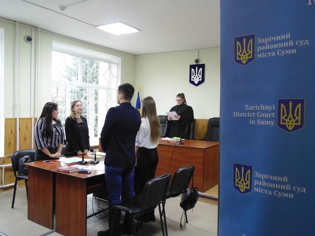 У Зарічному районному суді м. Суми відбулося модельне судове засідання зі студентами Сумської філії Харківського національного університету внутрішніх справ. У підготовці студентів взяли участь викладачі Яна Садикова, Наталія Горобець, Марина Василенко.