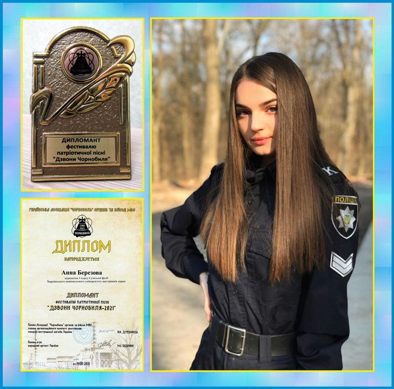 Курсантка 2 курсу Сумської філії Харківського національного університету внутрішніх справ Березова Анна стала дипломантом фестивалю патріотичної пісні «Дзвони Чорнобиля - 2021», який проводився дистанційно Українською асоціацією «Чорнобиль» органів та військ МВС спільно із народним артистом України Мар’яном Гаденком (м. Київ) до 35-ї річниці Чорнобильської катастрофи на АЕС.