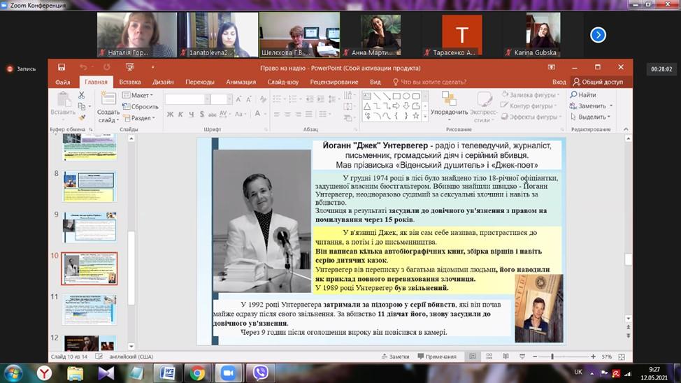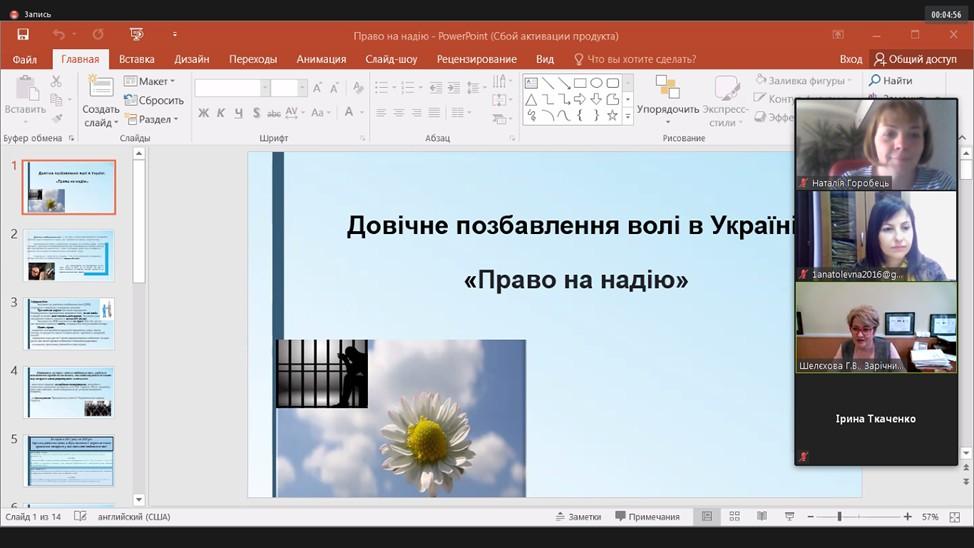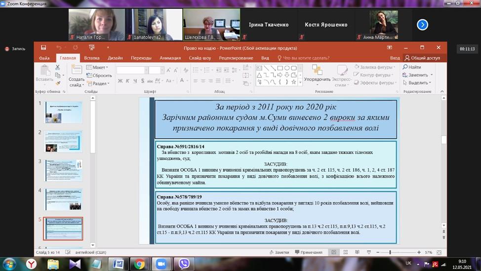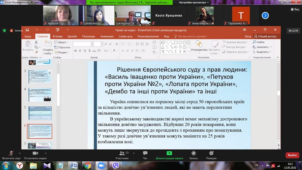 Лекторка розповіла про різні аспекти питання покарання у вигляді довічного ув’язнення. Указала на відсутність в українському законодавстві права засуджених на перегляд строку ув’язнення, що не відповідає практиці іноземних держав, на що неоднократно звертає увагу ЄСПЛ у своїх рішеннях проти України. Зустріч була проведена у дружній обстановці, цікава та викливала жвавий інтерес студентів. Із нетерпінням чекаємо на нові цікаві зустрічі з Ганною Валеріївною!