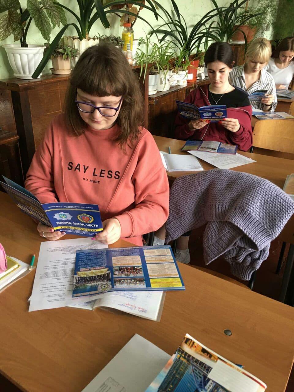 Учні отримали інформацію про умови вступу, особливості вступної кампанії 2021 року, вимоги до абітурієнтів та особливості підготовки зі спеціальності «Право» та «Правоохоронна діяльність» у Сумській філії ХНУВС як за контрактною формою, так і за кошти держбюджету. У нагоді стали інформаційно-профорієнтаційні друковані матеріали.