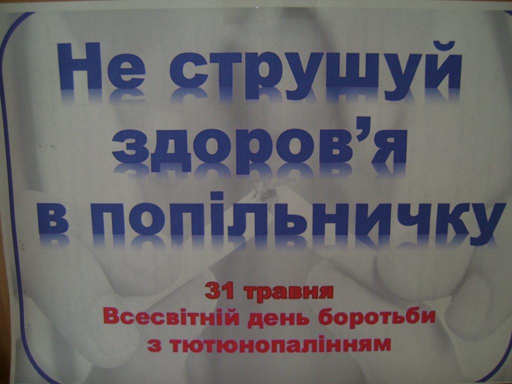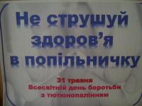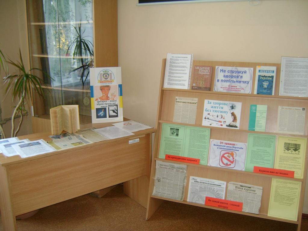 Основна мета відзначення Всесвітнього дня без тютюну – захистити теперішнє та майбутнє покоління не тільки від руйнівних наслідків для здоров’я, пов’язаних з тютюном, але також і від соціальних, екологічних та економічних наслідків вживання тютюну. Бібліотека долучилася до такого заходу й організувала вистаку-роздум під назвою «Не струшуй здоров’я в попільничку». На виставці підібрана література з даної тематики: книги, брошури, статті з періодичних видань, інформаційні підбірки: «Вплив куріння на організм людини», «Чому слід кинути курити?», «Міфи про куріння і реальність», «Як все-таки кинути?».