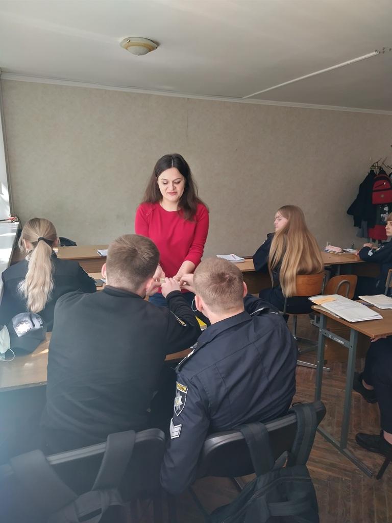 Практичний психолог охоче поділилась із курсантами досвідом застосування різних психологічних програм, які допомагають знайти правильне рішення у певних проблемних ситуаціях, у ситуаціях з ознаками домашнього насильства. Здобувачі вищої освіти стали учасниками комплексної психокорекції, заснованої на передових досягненнях вітчизняної та зарубіжної психологій.
