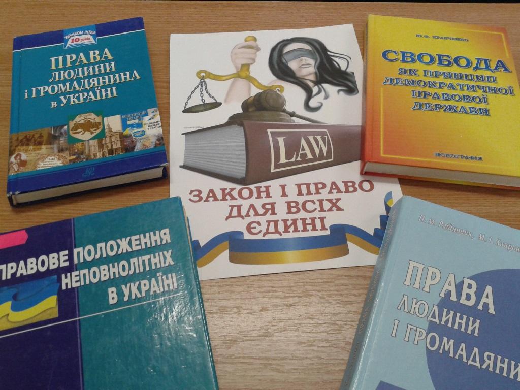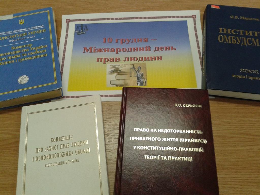 На виставці представлені видання із фонду бібліотеки :монографії, навчальні посібники, збірки науково-практичних конференцій та круглих столів стосовно актуальних питань, присвячених захисту прав людини в Україні, що сприятиме поглибленню правових знань та формуванню правової культури наших читачів, усвідомленню значення законів у житті держави та людини, виробленню внутрішньої потреби людини жити і діяти відповідно до норм права.
