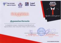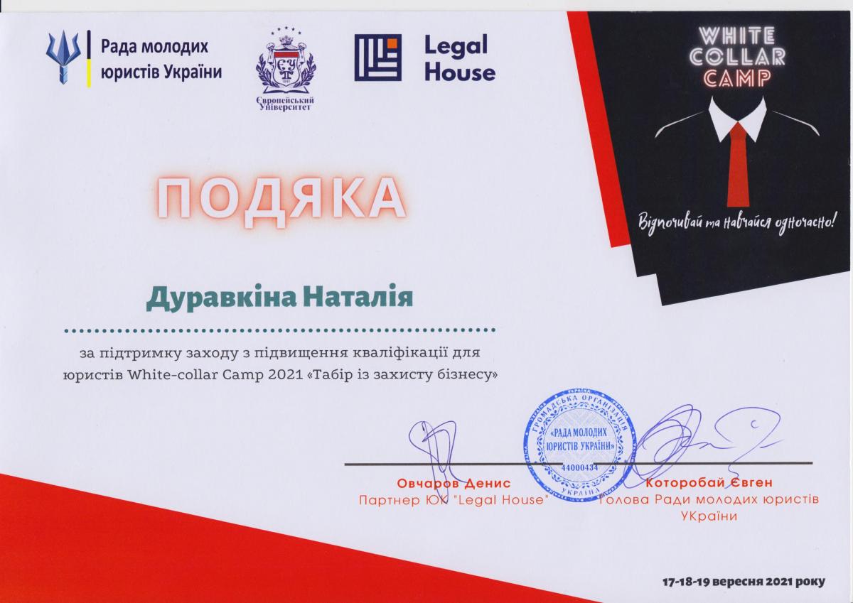 17-19 вересня 2021 року, на запрошення Ради молодих юристів України спільно з ЮК «Legal House», доцент кафедри юридичних дисциплін Сумської філії Харківського національного університету внутрішніх справ Наталія Дуравкіна, взяла участь у проведенні табіру із захисту бізнесу «White-collar Camp 2021.