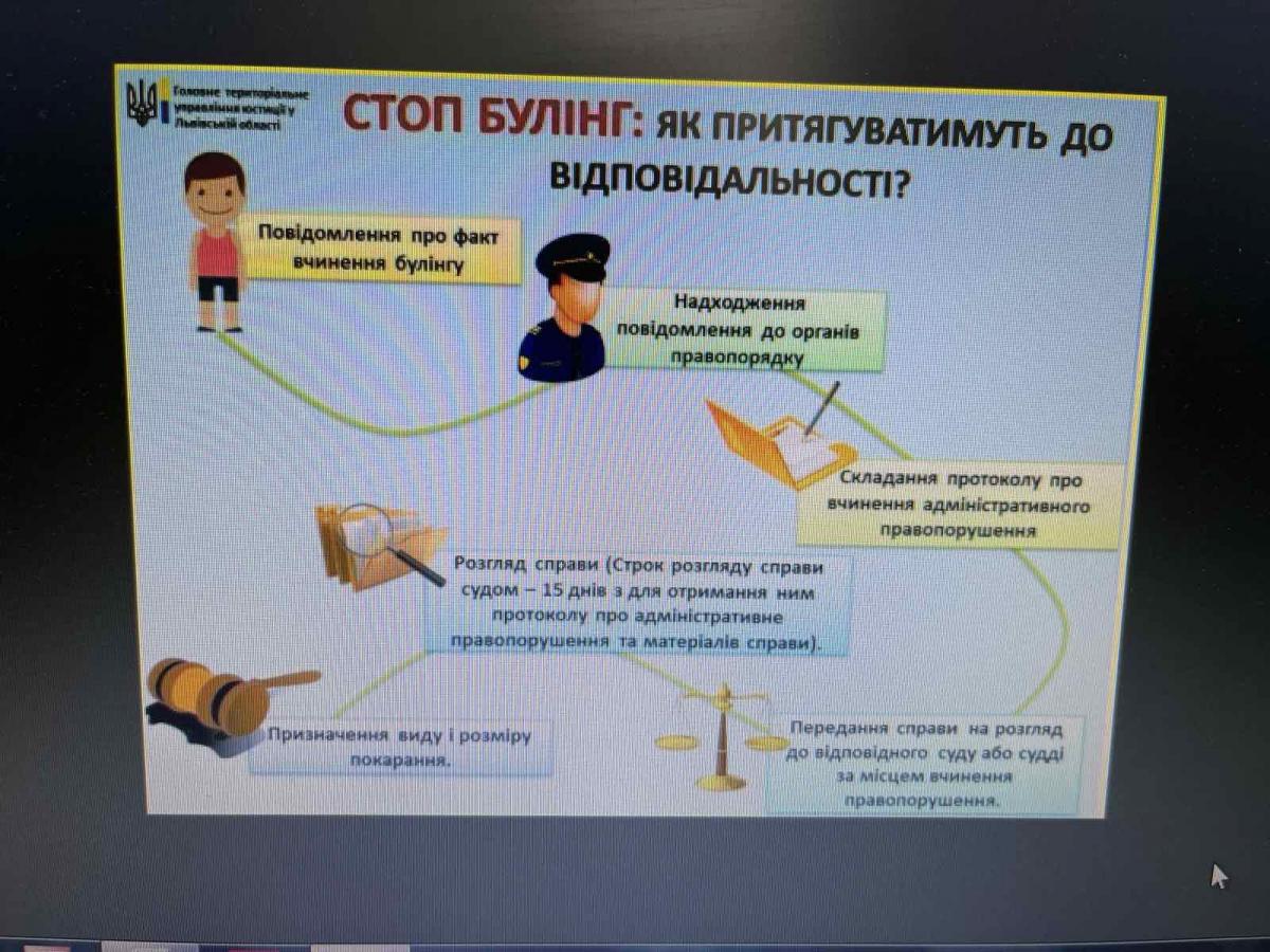 На виконання розпорядження Кабінету Міністрів України від 27 листопада 2019 року №1335-р. «Про запровадження плану заходів з реалізації Національної стратегії реформування системи юстиції щодо дітей на період до 2023 року», у Сумській філії Харківського національного університету внутрішніх справ інформаційно-роз’яснювальна робота щодо запобігання злочинності серед дітей, 29 вересня 2021 року старшим викладачем кафедри юридичних дисциплін Цвітаною Барановою була проведена онлайн лекція на тему: «Відповідальність за булінг у освітньому середовищі» для учнів Сумської ЗОШ №7.