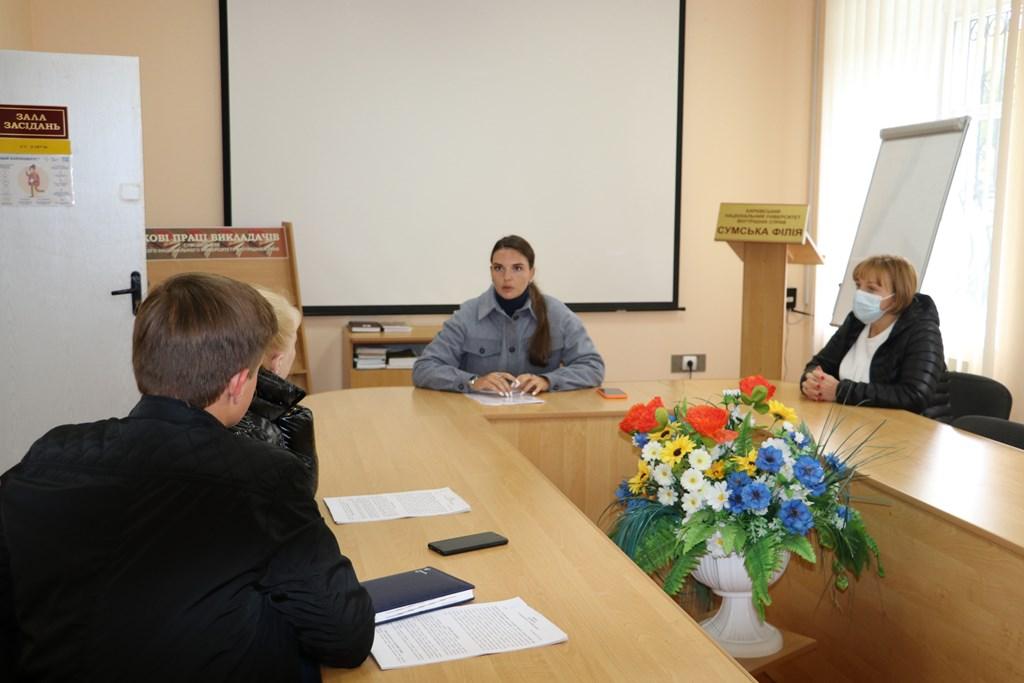 У Сумській філії ХНУВС проведено бінарне семінарське заняття для здобувачів другого (магістерського) рівня вищої освіти за спеціальністю 081 Право. Заняття проведено професором кафедри юридичних дисциплін Наталією Горобець та провідним юрисконсультом юридичного відділу державного підприємства «Дороги Сумщини», уповноваженою особою з питань запобігання та виявлення корупції Мариною Шаповал.