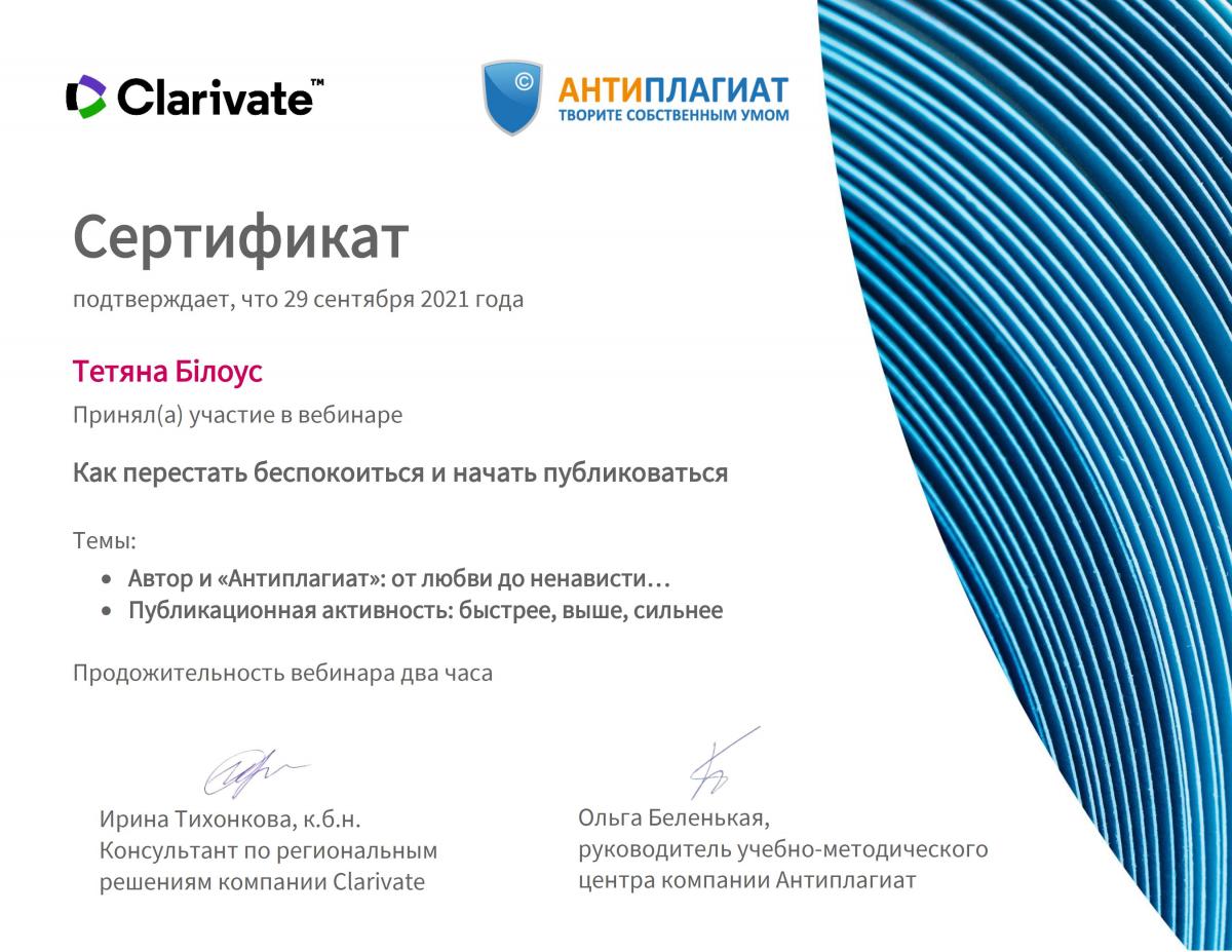 Доцент кафедри гуманітарних дисциплін Сумської філії Харківського національного університету внутрішніх справ к.пед.н., доцент Тетяна Білоус взяла участь у вебінарі, організованим компанією Clarivate.